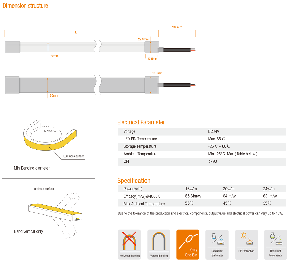 IP67 Flex led neon TW-N3020, Top bend, DC24V, Cross section size W30xH20mm, which is vertical bending with diameter of 300mm, it is IP67 protected, UV resistant, solvents resistant and saltwater resistant. Dot free will bring the most excellent performance for indoor and outdoor application